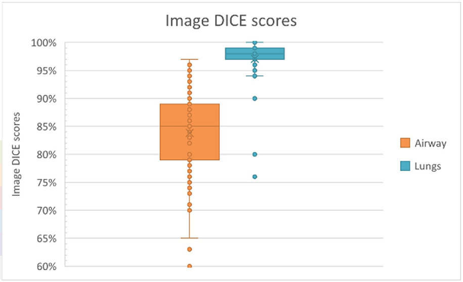 The nnunet-v2 model gave human-level lung segmentations with a similarity comparison of 97% overall. The model did not produce the same quality results with the airway segmentations compared to the lung; this was not a surprise to our researcher since the airway has large inter-reader variability amongst human segmentators as well. The airway images in this project were more challenging than average due to the patient size (being neonates) and pathology.