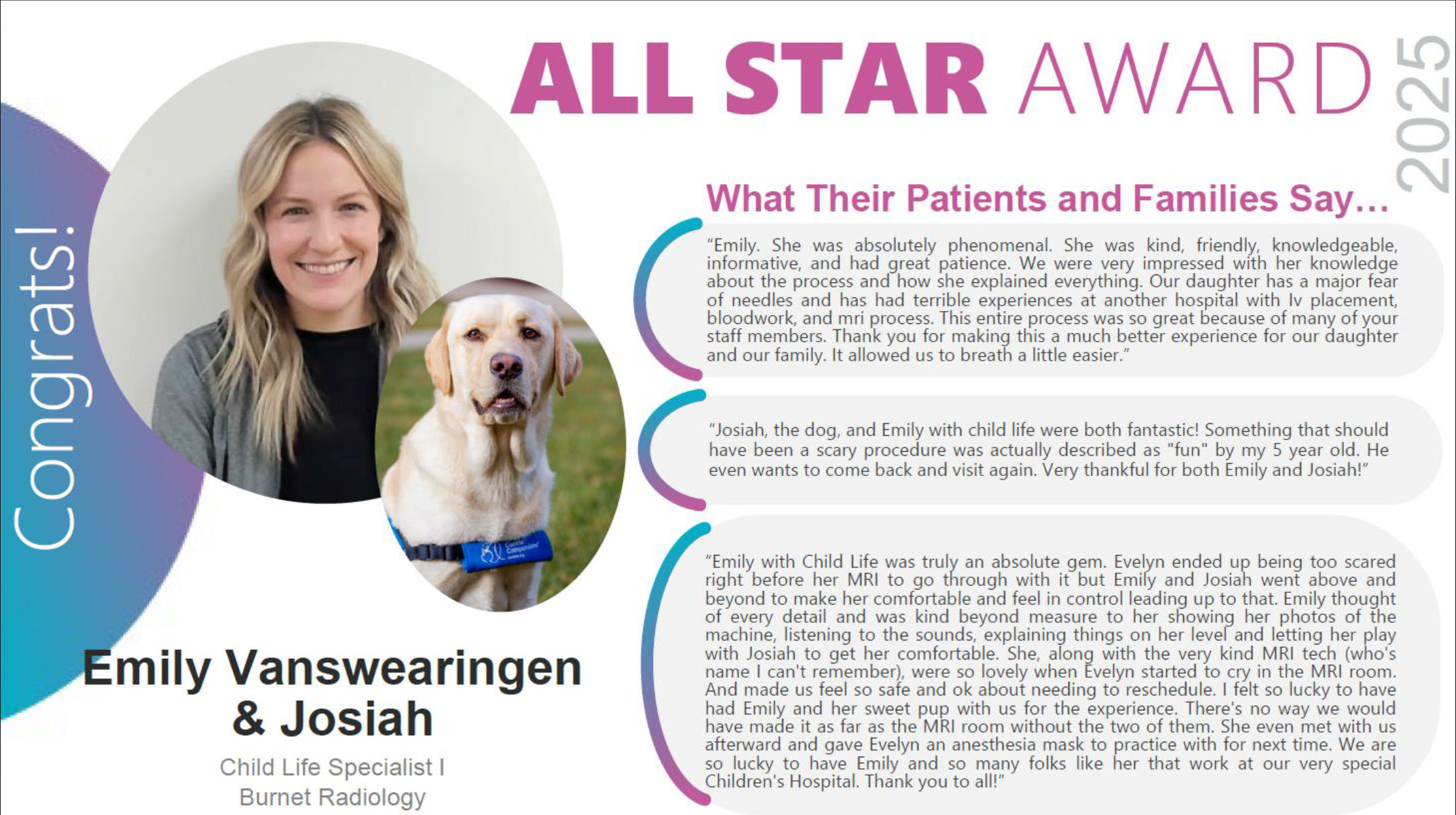 We’re so excited to celebrate the magic of Emily VanSwearingen as one of this year’s Cincinnati Children’s Patient and Family Experience All-Star Award recipients!